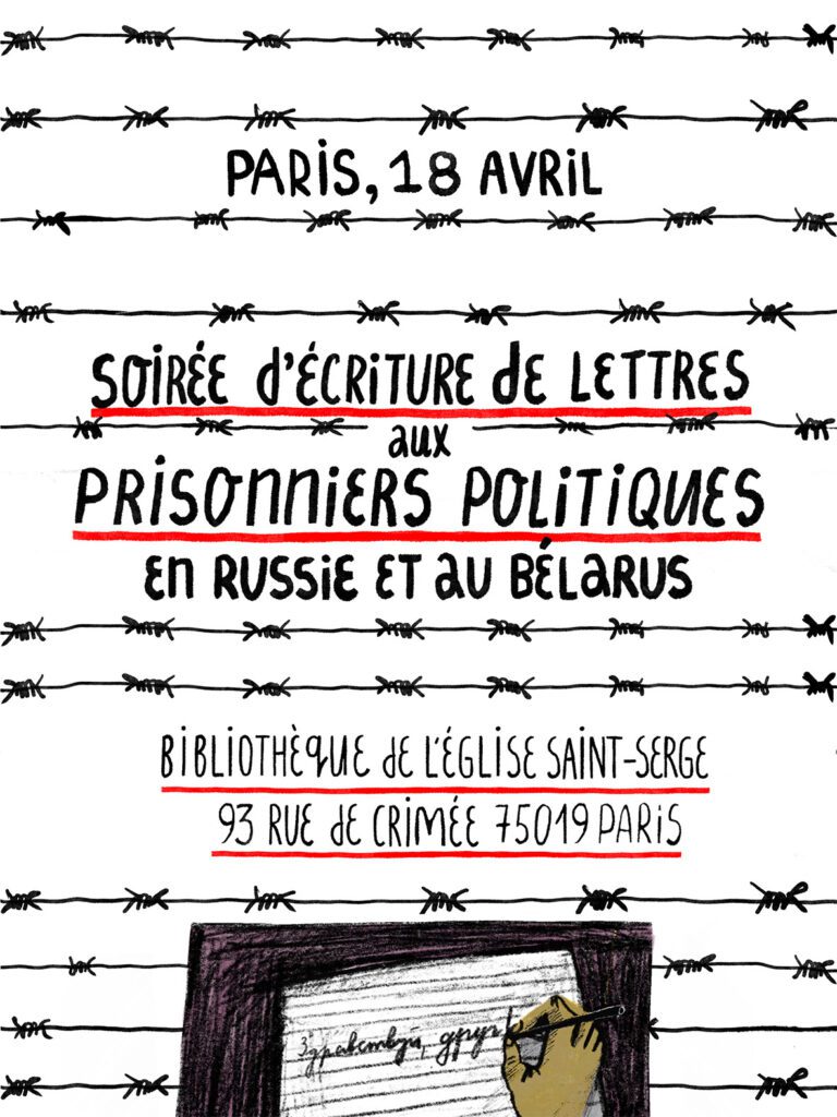 Апрельский вечер писем политзаключенным в России и в Республике Беларусь, организованный Мемориалом Франции, состоится в субботу 18 апреля, в Библиотеке Сергия Радонежского.