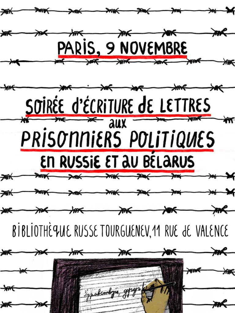 Ноябрьский вечер писем политзаключенным в России и в Республике Беларусь, организованный Мемориалом Франции, состоится в воскресенье 9 ноября, в Библиотеке Тургенева. На вечере мы расскажем о нюансах переписки с политзаключёнными и поделимся всеми материалами для писем.